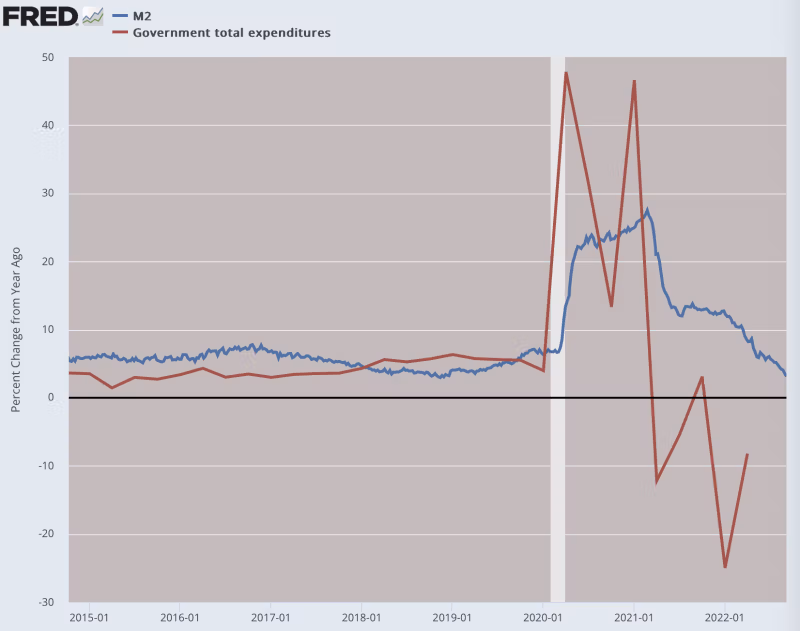 En total, hi ha una estreta correspondència entre els augments de la despesa governamental i els augments dels diners calents al carrer: entre 6 i 7 bilions de dòlars d'ambdós en poc més d'un any. Aquesta vegada, el partit va ser el 2008 amb mega dosis d'esteroides.