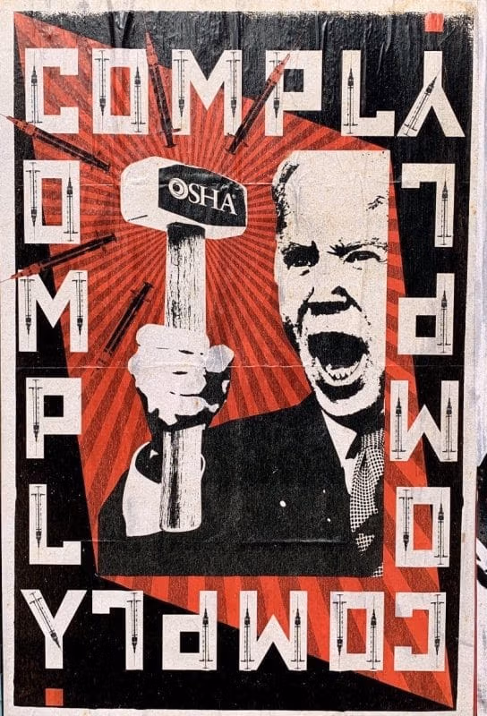 "Complir" és com podria semblar Biden si sortia d'una de les seves cases multimilionàries a les 2 del matí perquè li vau robar tots els gnoms de jardí. El mall d'Osha precisa del logotip és una mica de seriositat amenaçador perquè els mandats són un problema polític viu i conseqüent, però la seva cara i el "Comply" d'estil ciríl·lic carregat de vacunes impedeixen que ningú es prengui això seriosament.