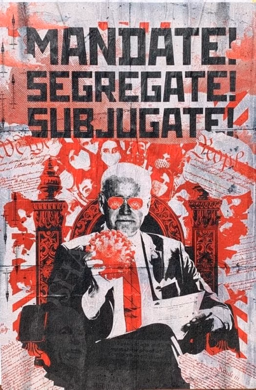El tercer cartell fa un gir més sinistre, “Mandat! Segregar! Subjugar!" Això és el més semblant en estil a un malèvol i caòtic vilà de còmics, una cosa de "Outer Church" de Morrison o potser Lucifer de DC Comics. Aquest cartell crida conspiració. La constitució destrossada, els cúmuls emmascarats, la reproducció fantasmal de Fauci a les ombres, tot és normal.