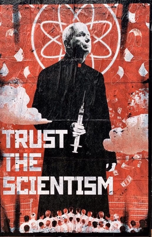 Això s'exemplifica amb més freqüència, i de manera graciosa, amb la frase "seguiu la ciència", que parodia aquest cartell. Aquí tenim en Fauci vestit de capellà, o potser en Neo de la Matrix. De qualsevol manera, la seva xeringa gegant sembla un accessori de Barri Sèsam, i el símbol de l'energia atòmica s'assembla més a alguna cosa de Pinky i el cervell que un lloc de proves nuclears.