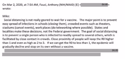 Però això ho sabem: el 2 de març de 2020, Fauci tenia el seu pla de joc alineat. Michael Gerson de la Washington PosLi va escriure aquell dia i li va preguntar sobre el propòsit del distanciament social. Això va ser setmanes abans que la majoria dels nord-americans fins i tot haguessin sentit aquest eufemisme per a la separació humana forçada. Va ser la idea d'esperar una vacuna, va preguntar Gerson?