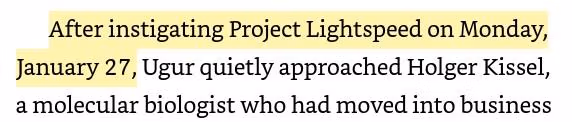 Per què Sahin i Türeci van postdatar el llançament del seu projecte de vacuna contra la Covid-19 al seu llibre? Bé, sens dubte perquè la data d'inici real, i no sabem quan va ser exactament la data d'inici real, hauria semblat massa aviat. D'acord amb les consideracions anteriors, hauria d'haver estat com a molt pocs dies després del primer informe del 31 de desembre de 2019 de casos de Covid-19 a Wuhan.