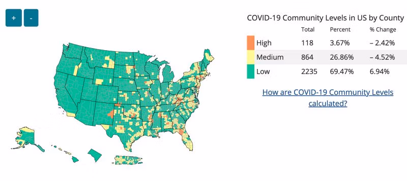 El CDC encara està recomana emmascarar-se en zones amb nivells de transmissió "alts". i també recomana l'emmascarament interior per protegir els contactes d'alt risc a les comarques "mitjanes". Actualment, això significa el 27% de tots els comtats dels EUA.