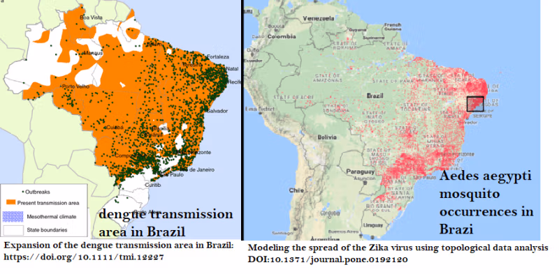 En resum, el mapa de la malaltia del dengue se solapa amb el Distribució del mosquit Aedes aegypti; mentre que les afirmacions sobre la microcefàlia del Zika eren més fortes on la gent parlava més de la microcefàlia del Zika.
