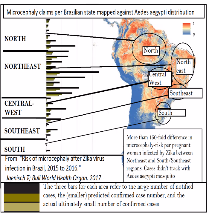 Microcefàlia: a part d'una versió "primària" greu, rara i genèticament recessiva, mai no havia tingut una causa individual predominantment identificable. Més aviat es tracta d'una quantificació física i estadística caracteritzada mèdicament de manera causal com a "multifactorial", és a dir, vagament connectada amb un infinitat d'agents potencials (la majoria dels quals [subratllats] coincideixen amb la pobresa).
