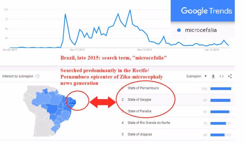 La filtració de descobriment de Zika de S&SC va cridar l'atenció dels mitjans, però les ramificacions de salut pública absents aviat es van apagar. D'altra banda, la filtració de premsa britànica de Zika-microcefàlia va comunicar un perill imminent i es va convertir ràpidament en un pànic regional, després nacional i després mundial, aquest últim parcialment augmentat per la coincidència de les preocupacions de viatge de les elits pel que fa als Jocs Olímpics de Rio. La microcefàlia relacionada amb el Zika va incloure finalment menys del 5% de les reclamacions originals de l'era del pànic. Els metges del Brasil van sobrediagnosticar els nounats, per alguna combinació de pànic, precaució excessiva i els estàndards de microcefàlia incorrectes i inconsistents del Brasil en aquell moment. La microcefàlia (tal com s'afirma) es va concentrar i va coincidir amb la ubicació i el moment del pànic generat per les notícies (a Recife i el nord-est del Brasil) més que no pas amb l'abast del propi mosquit vector.
