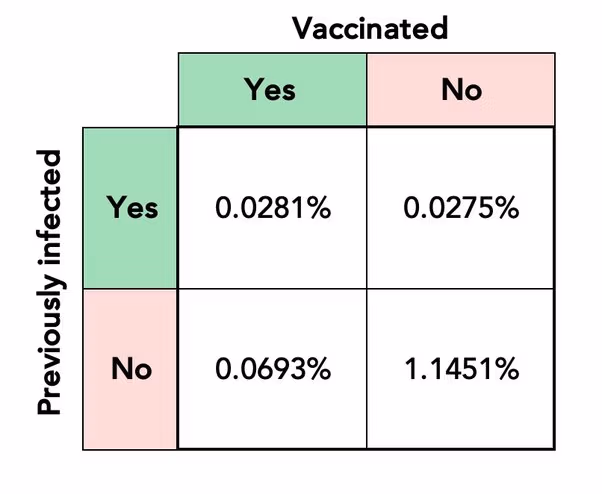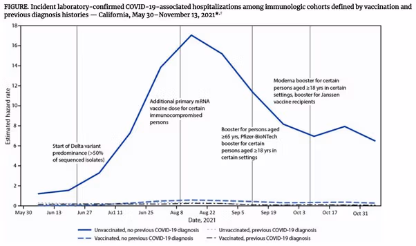 El CDC no està d'acord. El 20 de gener de 2022 va publicar una anàlisi de 22 milions de casos positius durant el Onada delta a Califòrnia i Nova York del 30 de maig al 20 de novembre, detallant les taxes d'hospitalització amb malaltia greu. Aquest és el mètrica principal preocupant, ja que aquestes vacunes no eviten la infecció, i els casos d'infecció i reinfecció són inevitables al llarg de la nostra vida. No indica pràcticament cap diferència significativa entre els vacunats i els no vacunats amb infecció prèvia.