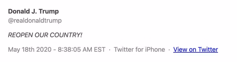 Tres setmanes després, amb la gran reobertura de Setmana Santa ja havia arribat i se n'havia anat, alguns governadors republicans estaven disposats a renunciar als bloquejos. En aquest moment, 36 dies després de la seva crida inicial per a un bloqueig, Trump es va fer públic, tant en una conferència de premsa com a Twitter, per criticar fins i tot els més petits esforços per acabar amb els seus propis bloquejos.